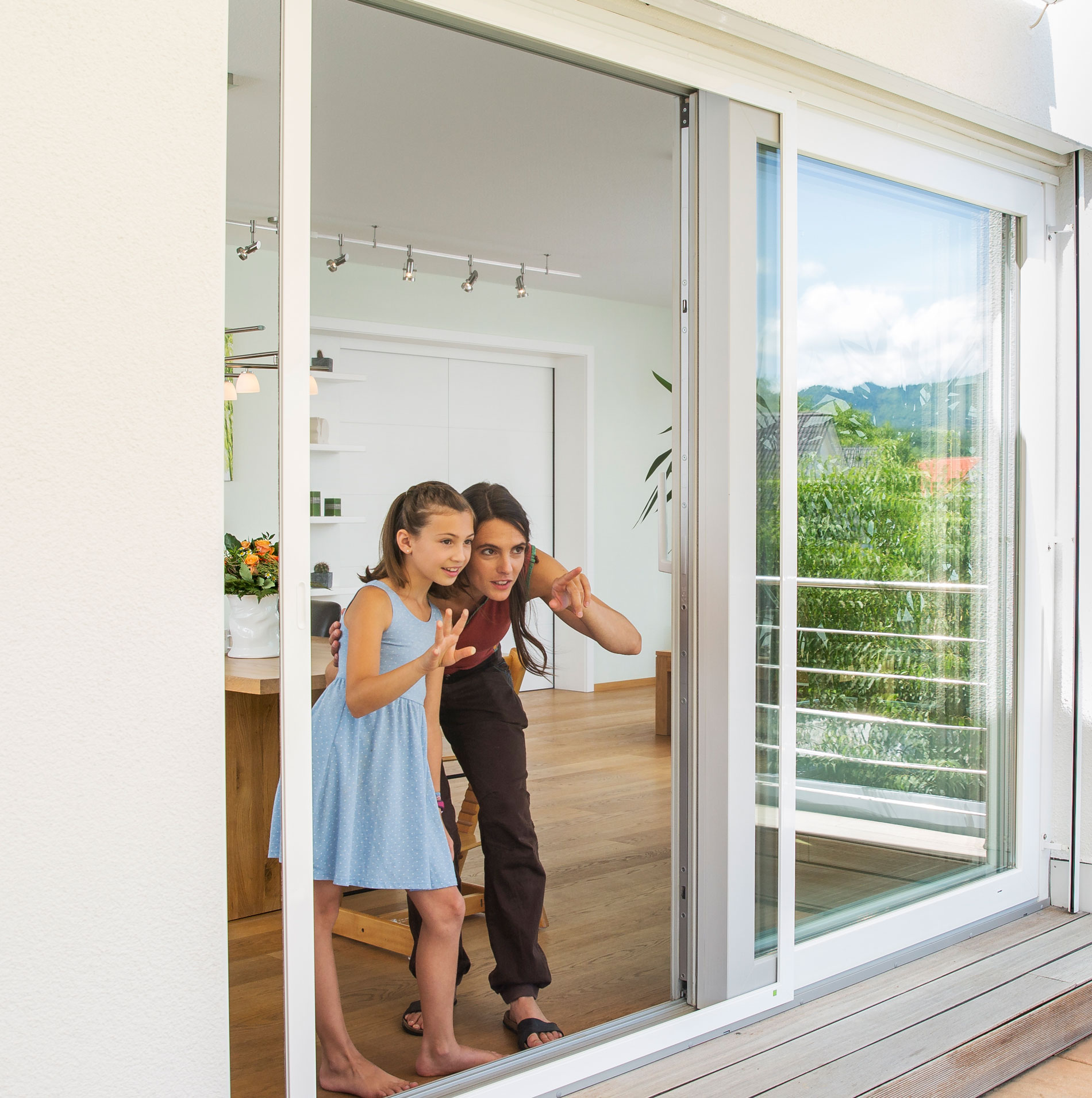Große Schiebeelemente kommen für den Insektenschutz für Türen zu Balkon und Garten zum Einsatz: Trotz Ihrer Größe sind die Türen kaum zu sehen – und fast nicht zu hören. Ein Edelstahlrollenlager sorgt für einen ruhigen Lauf.